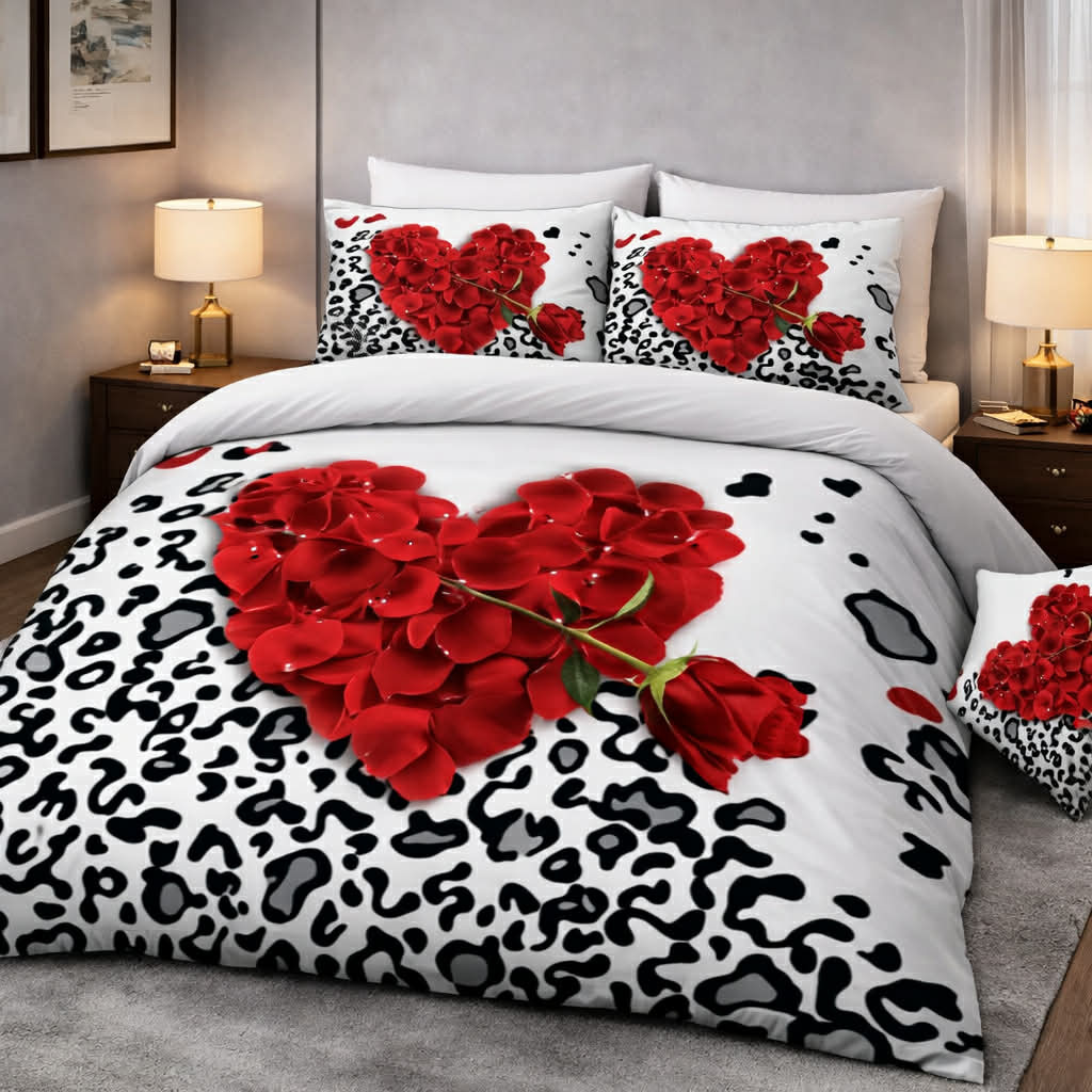 A piros szirmokból formált szív motívum és a fekete-fehér mintázat különleges, látványos megjelenést biztosít, amely azonnal a szoba központi elemévé teszi az ágyat.