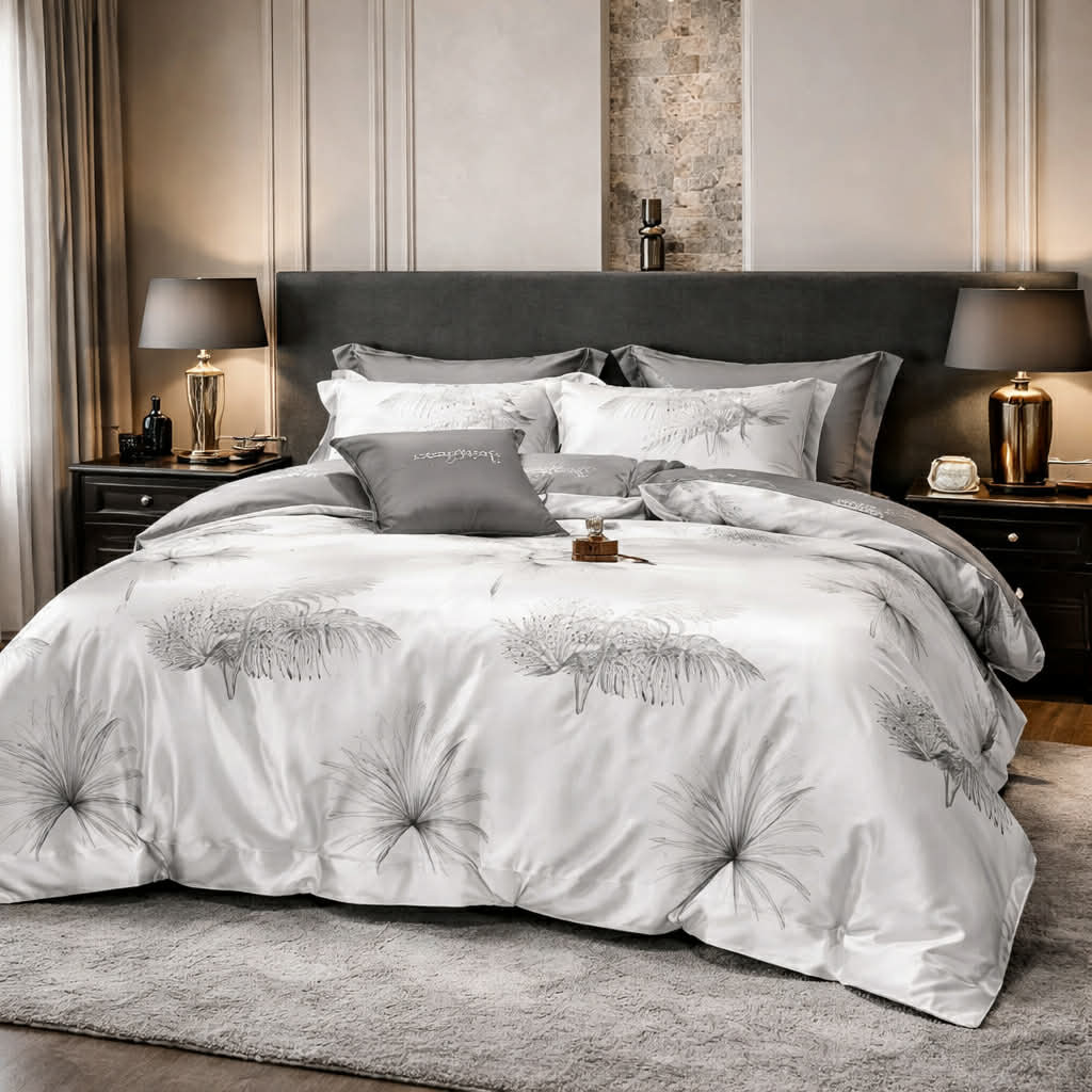 Ez a szürke árnyalatokban megjelenő, finom növényi mintás ágyneműhuzat tökéletes választás a modern és elegáns hálószobákhoz.