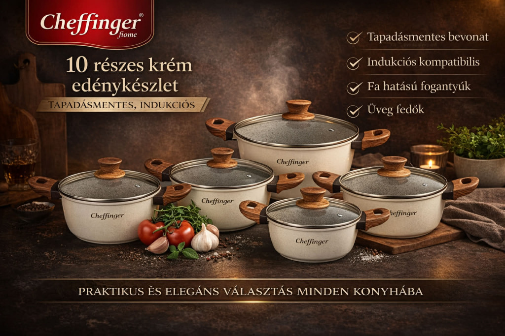 Modern és elegáns megjelenésű, 10 részes Cheffinger edénykészlet, amely tökéletes választás minden konyhába. A kiváló minőségű tapadásmentes bevonatnak köszönhetően az ételek nem ragadnak le, így a főzés és a tisztítás is egyszerűbb.