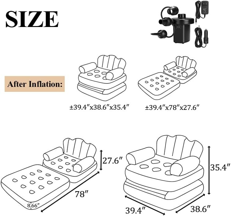 A kanapé 39,4″ x 38,6″ x 35,4″ méretű, és alkalmas olvasásra vagy munkára. Teljesen kinyitható kanapévá téve mérete 78″ x 27,6″ x 8,66″ és lehetővé teszi, hogy pihenjen és aludjon rajta.