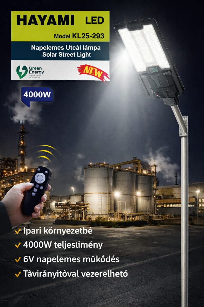A Hayami KL25-293 napelemes LED utcai lámpa ideális választás udvarok, utcák, parkolók és ipari területek megvilágítására.