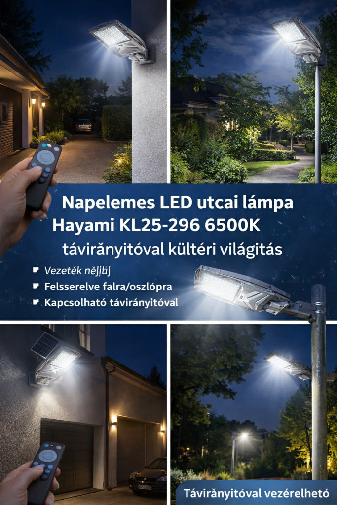 A Hayami KL25-296 napelemes LED utcai lámpa ideális választás udvarok, kertek, parkolók vagy ipari területek megvilágítására.