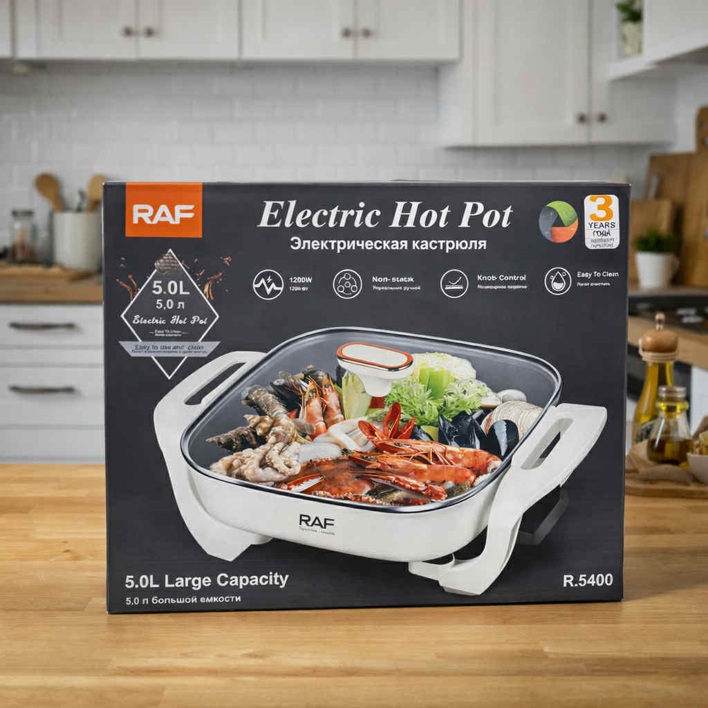 Nagy kapacitású, 5 literes RAF elektromos főzőedény 1200W teljesítménnyel és tapadásmentes bevonattal.